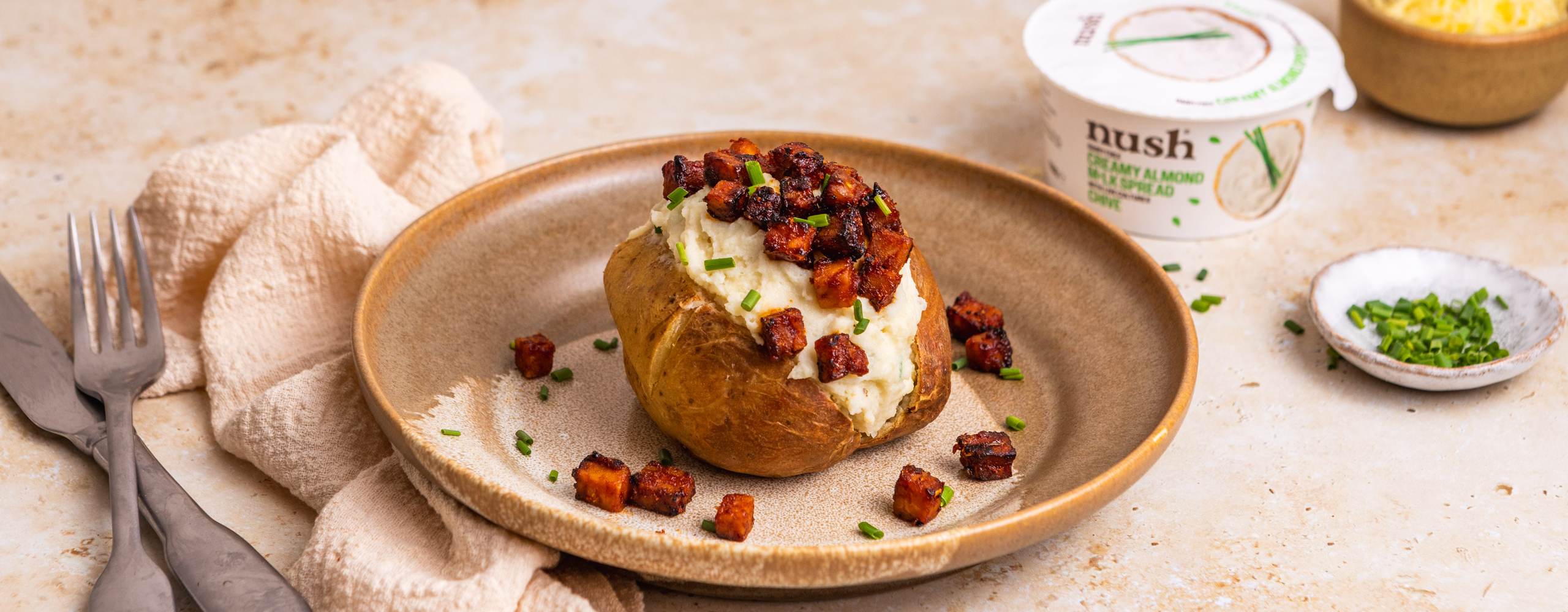Top the hot stuffed potatoes with an extra dollop of Nush Chive Spread, crispy tempeh bacon pieces, and a sprinkle of fresh herbs.